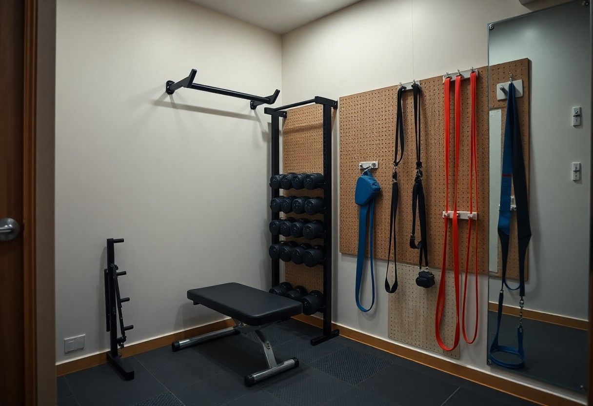 Flexibel setzt du modulare Möbel ein, die Sitzflächen, Stauraum und Trainingsstationen kombinieren; versteckte Funktionen wie ausklappbare Hantelbänke maximieren Nutzfläche.